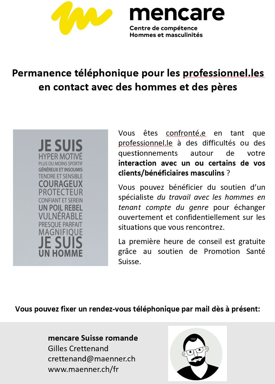 Notre guide « Impliquer les pères – Un guide pour les professionnel.les de la santé périnatale et de la petite enfance » rassemble les connaissances et les expériences de plus de 60 formations d’institutions et de professionnel.les réalisées entre 2021 et 2023. il transmet des connaissances, montre quelle attitude professionnelle est liée à un accueil inclusif des pères et rend les bonnes pratiques accessibles. Il fournit des suggestions et des outils concrets et indique les possibilités de soutien externe.