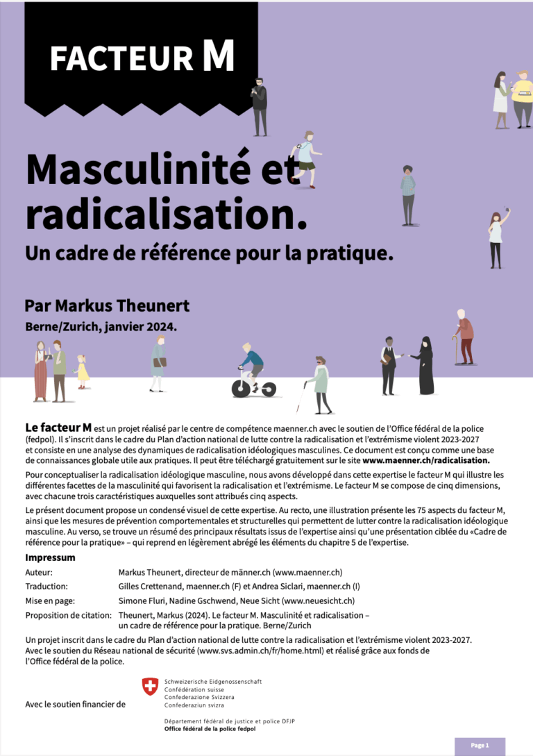 Le projet a identifié cinq dimensions qui, ensemble, constituent le « facteur M ». Ce facteur M représente les facettes de la masculinité qui favorisent la radicalisation et l’extrémisme (la masculinité est comprise comme l’ensemble des exigences culturellement transmises qu’un garçon ou un homme doit remplir pour être considéré comme « masculin »). Le rapport « Le facteur M » doit permettre aux professionnel.les et aux services régionaux de mieux comprendre les dynamiques de radicalisation, de les détecter plus tôt et de les contrer plus durablement.