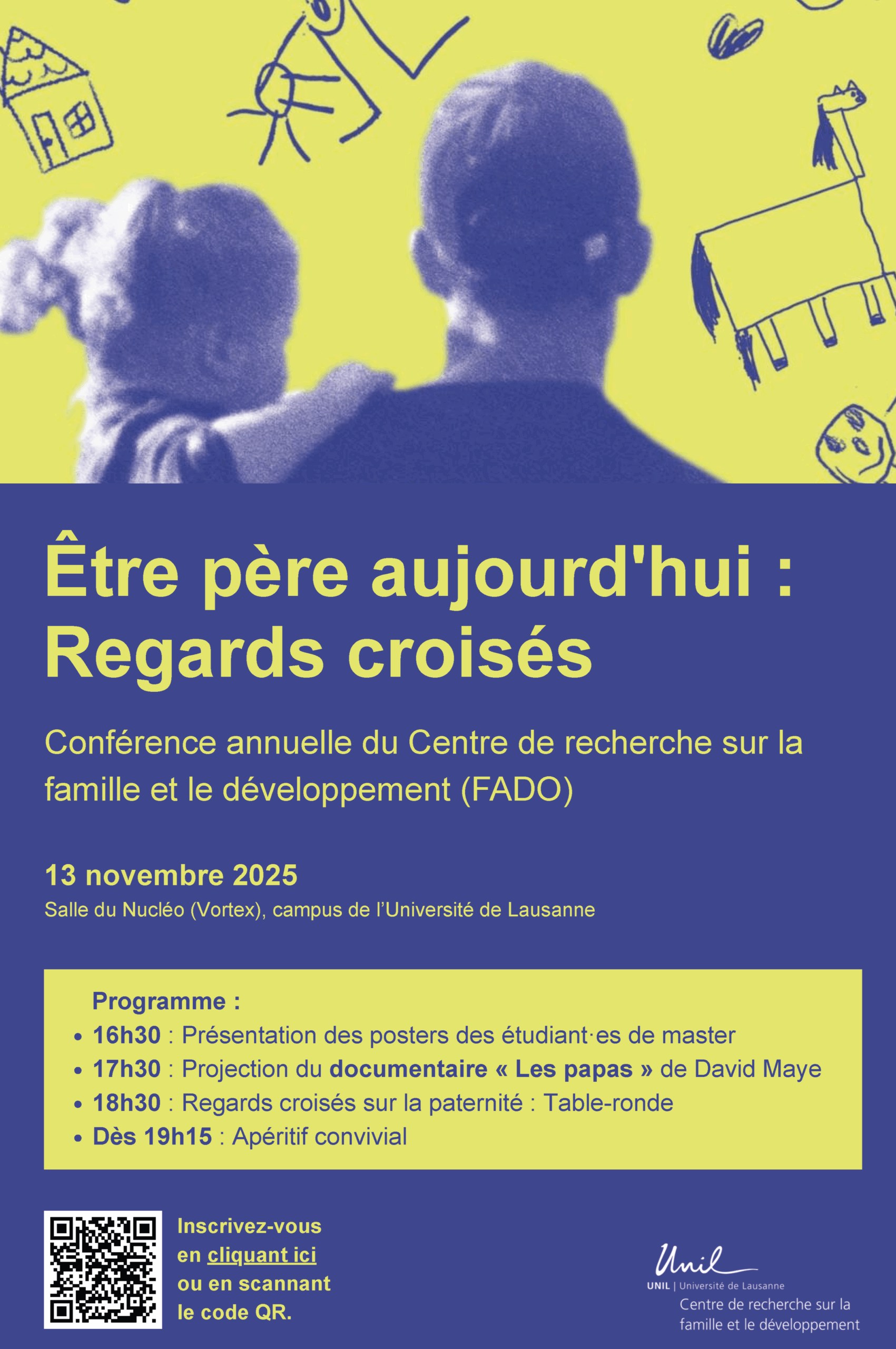 Le jeudi 13 novembre 2025, UNIL par son Centre de recherche sur la famille et le développement (FaDo) organise une journée autour du thème « Être père aujourd’hui : Regards croisés ». Cet évènement public s’inscrit dans des rencontres annuelles visant à renforcer les liens entre le monde académique, les professionnel·les du terrain et le grand public.