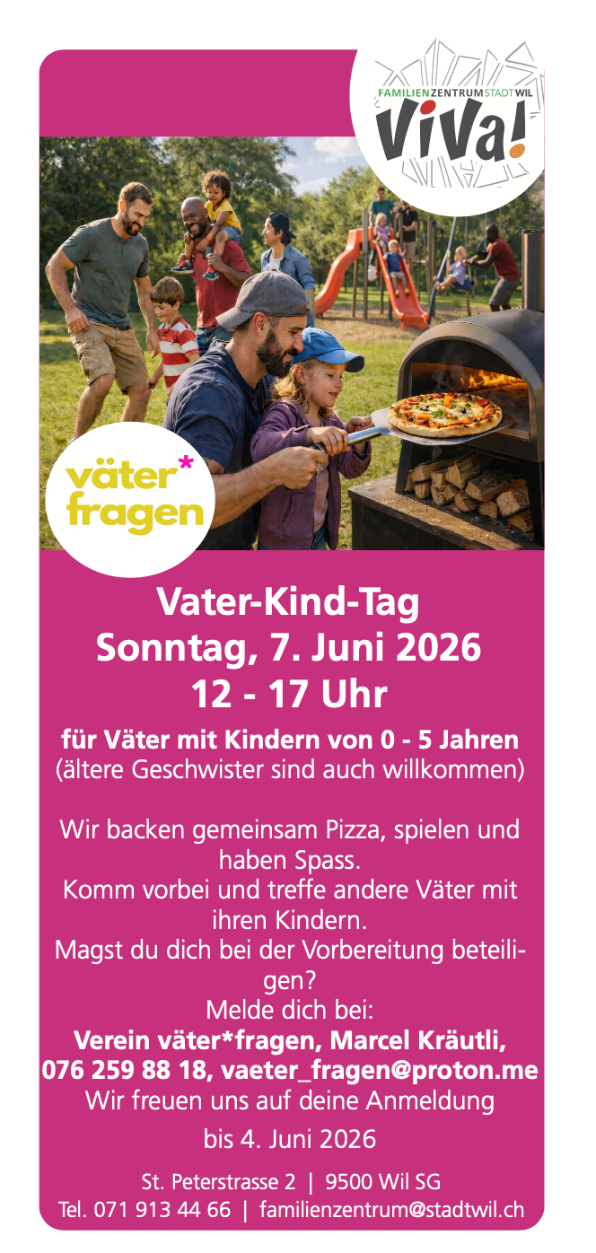Verein väter*fragen, Marcel Kräutli, 076 259 88 18, vaeter_fragen@proton.me Wir freuen uns auf deine Anmeldung